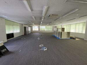 2階の床はOA(二重構造の)フロアとなっており電気・電話・インターネット等の配線を床下に収納できるため、新調されるデスクの配置に合わせて配線をし、現在はフロア全体の半分が完了した状態です。