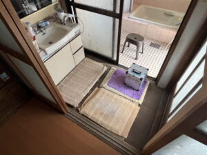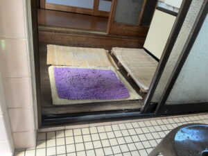 廊下から脱衣室、脱衣室から浴室に入る際にそれぞれ段差がありますが、リフォーム後は廊下から浴室までフルフラットになる予定です。